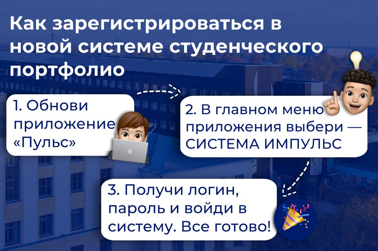 Уважаемые студенты! Напоминаем, что для учёта ваших внеучебных достижений (научных, общественных, спортивных, творческих, учебных) для повышенной стипендии используется система электронного портфолио «Импульс».