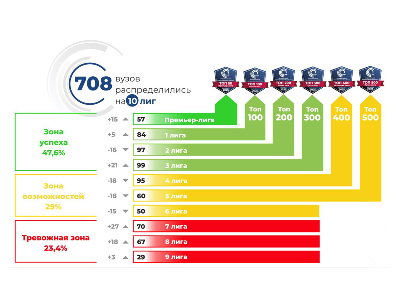 708 вузов распределились на 10 лиг. В зеленую зону успеха попали чуть менее половины вузов (337 вузов), в желтую зону возможностей определены 29% (289), в тревожную зону попали 23% (166) вузов.