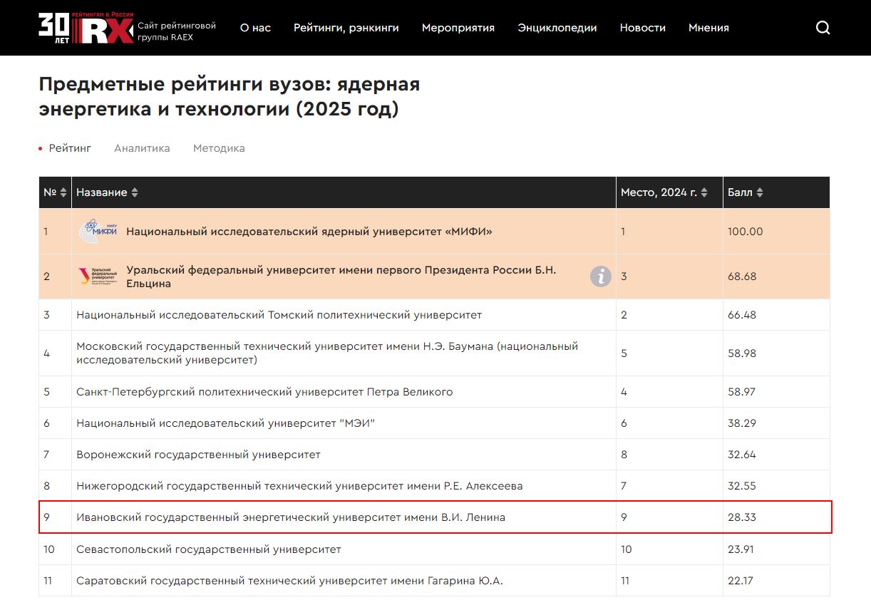 ИГЭУ занимает 9-ое место по направлению «Ядерная энергетика и технологии». Главная цель предметного рейтинга RAEX — помочь абитуриентам в вопросе выбора профильного вуза.