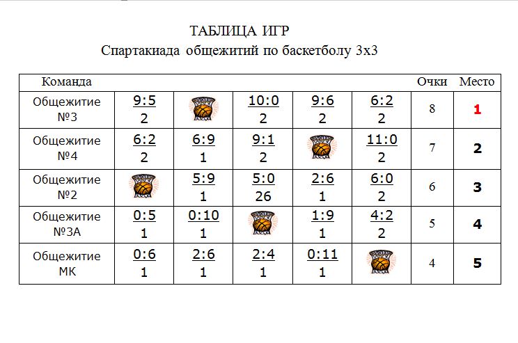 Соревнования проводились по круговой системе, все участники сыграли по 4 игры. Лучшие результаты показала команда общежития №3. Она и стала победителем соревнований.