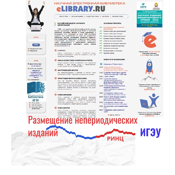 Непериодические издания – это все книги (монографии, справочники и словари, учебники и учебные пособия, сборники статей), труды конференций, диссертации и авторефераты диссертаций. Сотрудники библиотеки ИГЭУ на протяжении 11 лет занимаются размещением материалов в Национальной электронной библиотеке в формате метаданных (название, сведения об авторах, аннотация, ключевые слова, библиографический список литературы и полный текст публикации). Такое сотрудничество открывает хорошие возможности публикации статей для обучающейся молодежи - студентов и аспирантов. В 2024 году в базу данных НЭБ было внесено 4 сборника научных трудов и 10 сборников материалов научных конференций - всего 1055 записей публикаций авторов, работающих и обучающихся в нашем университете.