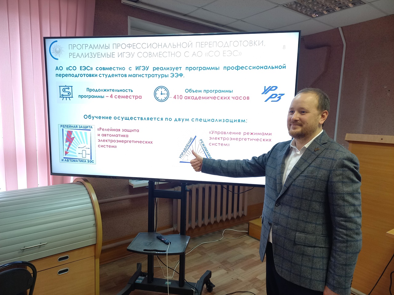 Отдельный акцент спикер сделал на программах профессиональной переподготовки, которые реализуются ИГЭУ совместно с АО «СО ЕЭС» по направлениям «Управление режимами электроэнергетических систем» и «Релейная защита и автоматика электроэнергетических систем». Программы, по объему превышающие 400 академических часов, включают в себя не только интересные лекции и семинары, но и практику в диспетчерских центрах АО «СО ЕЭС».