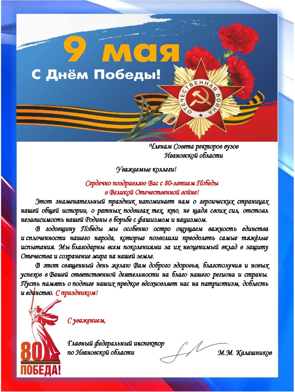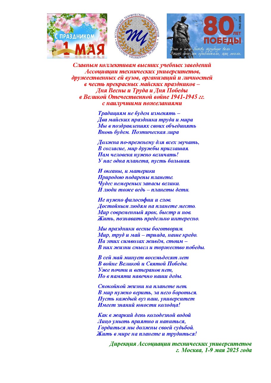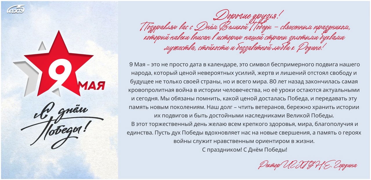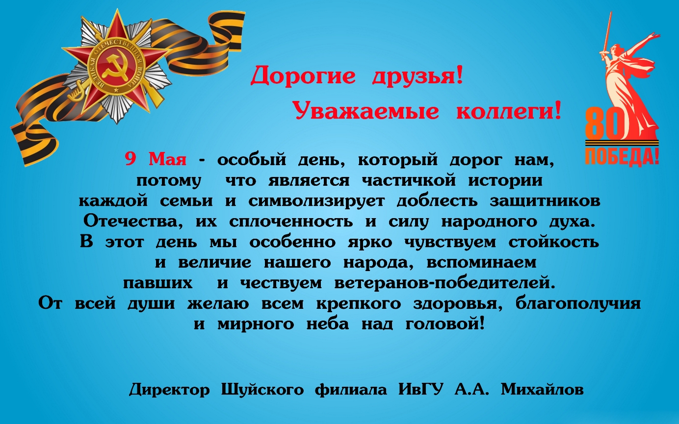 Ивановский государственный энергетический университет, воспитывая новые поколения специалистов, всегда ставил перед собой цель не только передавать знания, но и сохранять память о великих свершениях предков. И в эти знаменательные дни мы особенно осознаём ответственность за сохранение и продолжение традиций воинской доблести, патриотизма и гражданского долга. Каждый из нас обязан помнить: именно благодаря Великой Победе, 80-летие которой отмечается сегодня, мы имеем возможность учиться, работать и строить светлое будущее.