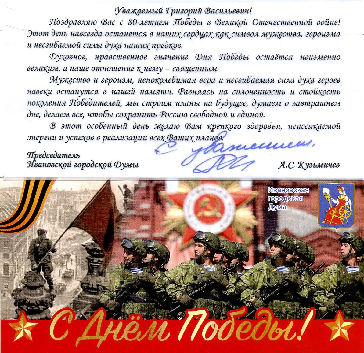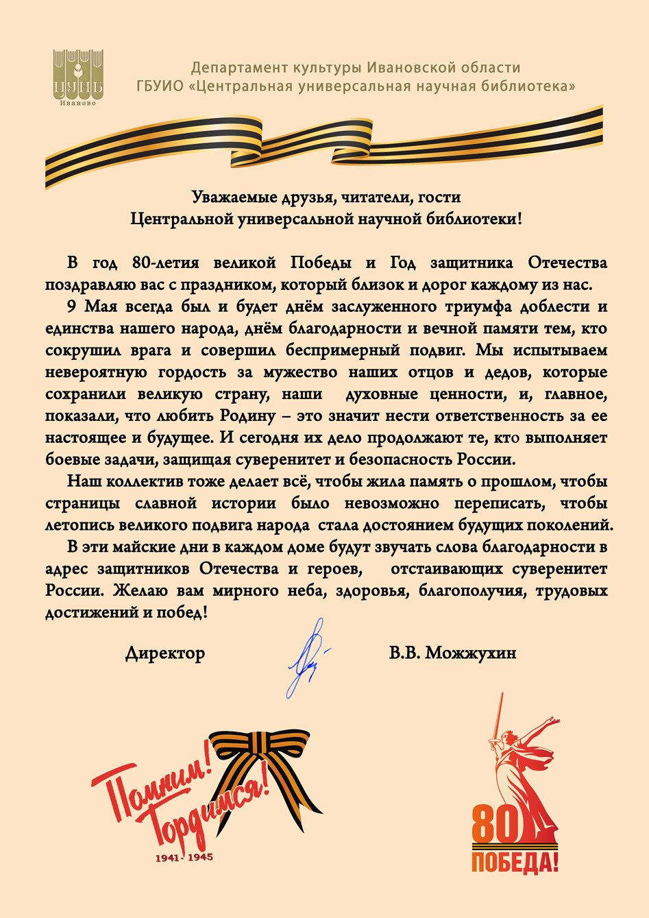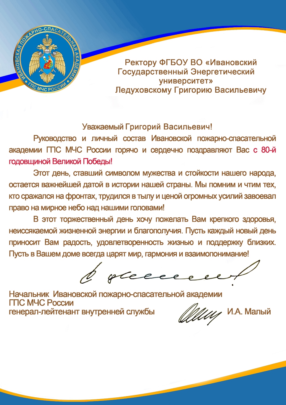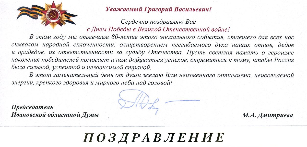 От имени всего коллектива Ивановского государственного энергетического университета хочу выразить глубокую благодарность ветеранам Великой Отечественной войны и труженикам тыла, их семьям, а также всему российскому народу за то, что они сделали и делают для сохранения памяти о подвиге наших предков.