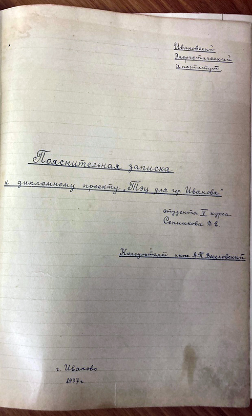 Уникальный документ первого десятилетия с момента основания ИГЭУ/ИЭИ (1930 г.) многое может рассказать о подготовке специалистов в области теплоэнергетики 1930-х годов: тема диплома В.Е. Сенникова непосредственно привязана к текущим задачам развития энергетических объектов региона – ТЭЦ г. Иваново, Сосневский район. Соответственно, проект и расчёты могли использоваться и, возможно, использовались как рабочий документ при планировании и эксплуатации энергосистемы. Помимо этого, Записка содержит интересные сведения, касающиеся подготовки диплома. В частности, насыщенный список используемой литературы включает блестящие имена советских специалистов, в том числе корифеев ивановской высшей технической школы, преподавателей ИЭИ  – Вячеслава Владимировича Сушкова и Михаила Сергеевича Масленникова.
