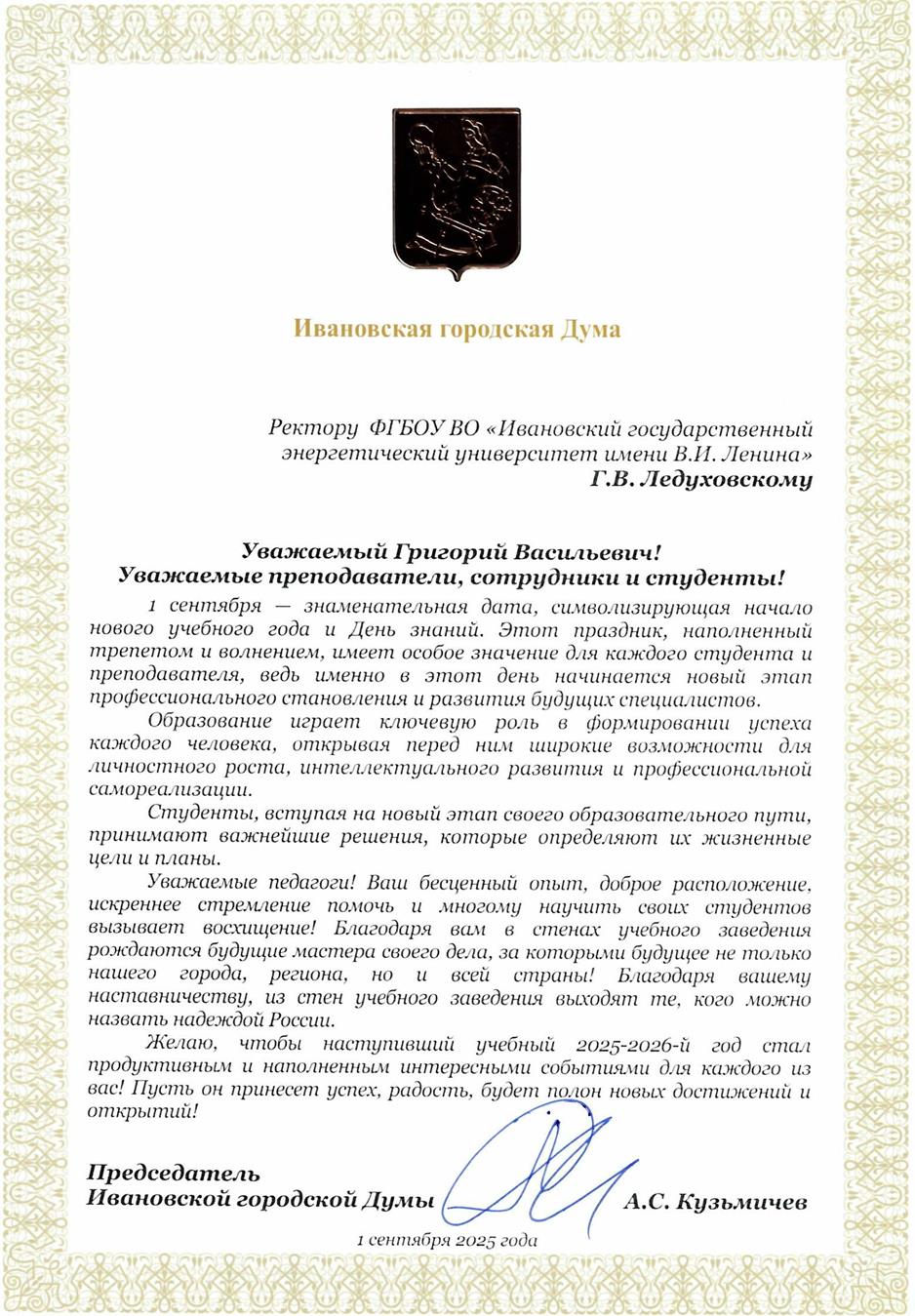 Желаю студентам, преподавателям и сотрудникам ИГЭУ новых достижений в 2025/2026 учебном году!