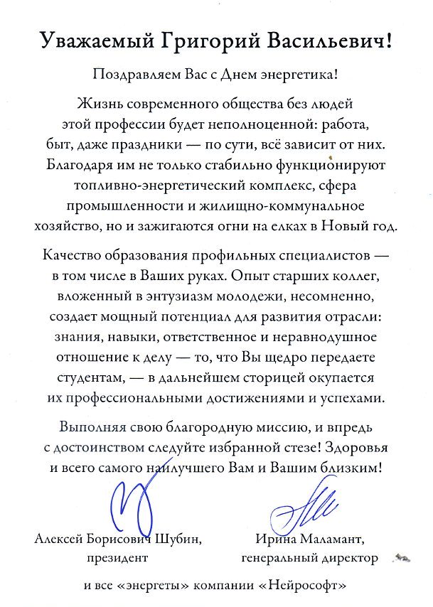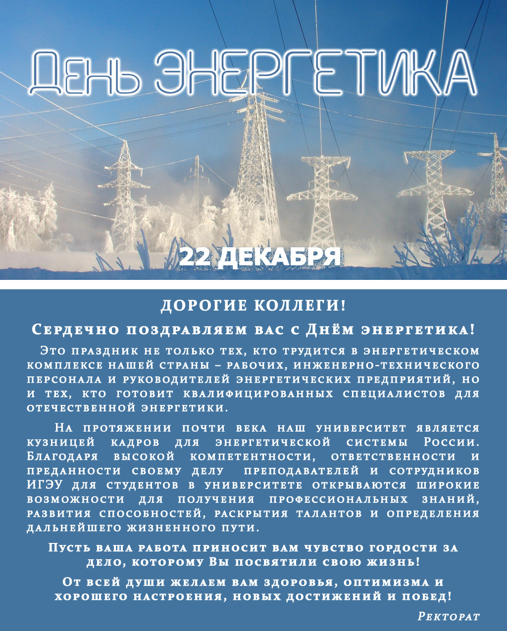 Это праздник не только тех, кто трудится в энергетическом комплексе нашей страны – рабочих, инженерно-технического персонала и руководителей энергетических предприятий, но и тех, кто готовит квалифицированных специалистов для отечественной энергетики.