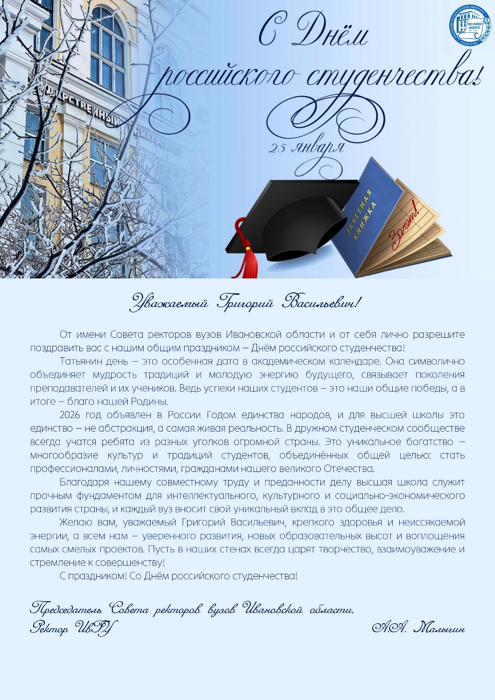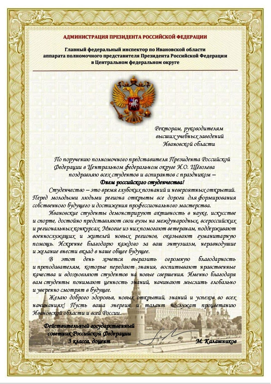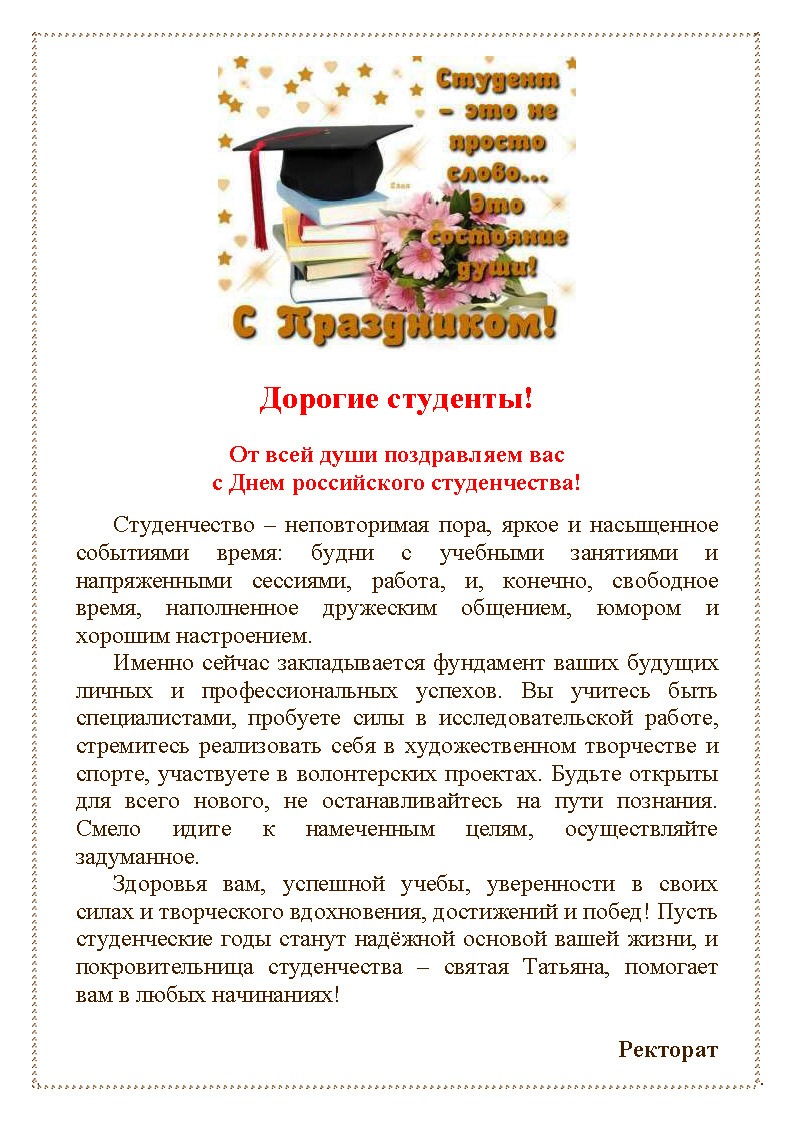 Дорогие студенты, от всей души поздравляем вас с Днем российского студенчества! Здоровья вам, успешной учебы, уверенности в своих силах и творческого вдохновения, достижений и побед! Пусть студенческие годы станут надёжной основой вашей жизни.