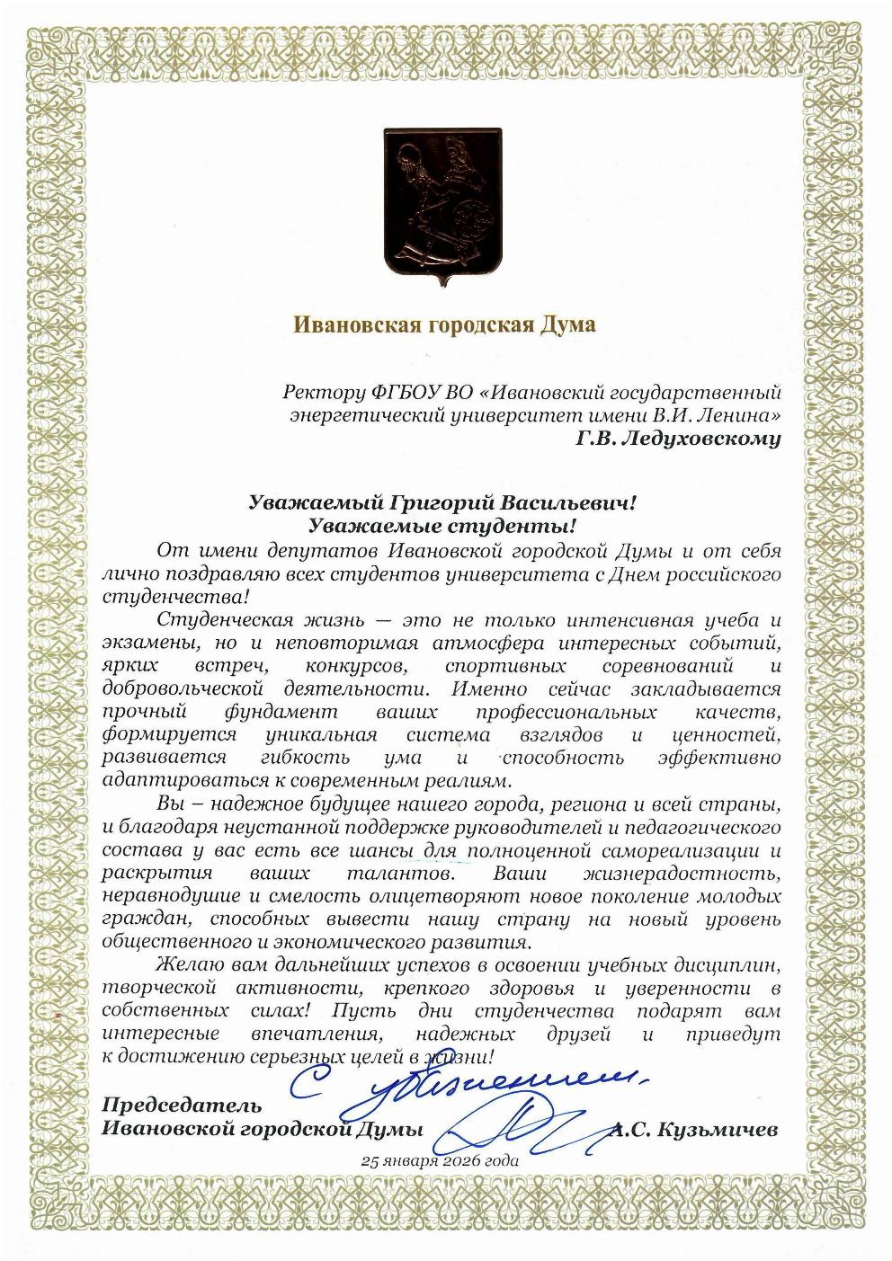 Коллектив Ивановского государственного энергетического университета поздравляет всех студентов с праздником! Пусть студенческие годы будут для вас счастливыми, насыщенными множеством запоминающихся ярких моментов, богатыми на достижения и победы! Перед вами открыты все дороги и широкие возможности. Воспользуйтесь ими максимально эффективно, ведь именно сейчас закладывается фундамент ваших будущих свершений! Удачи и успехов вам во всех начинаниях!